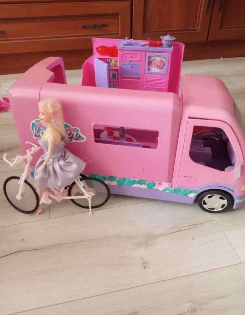 Duży kamper dla lalek barbie z akcesoriami i rower z lalką.